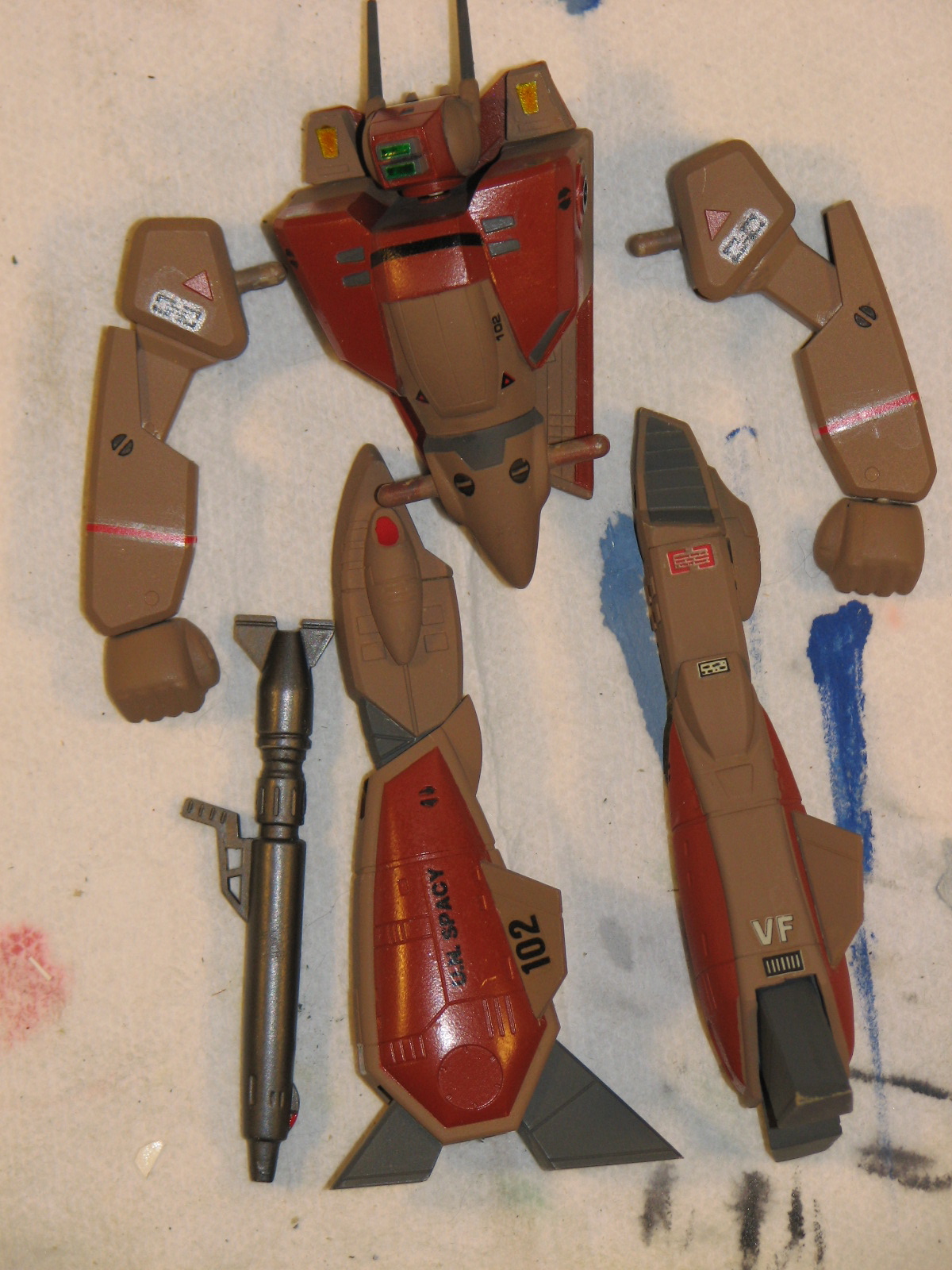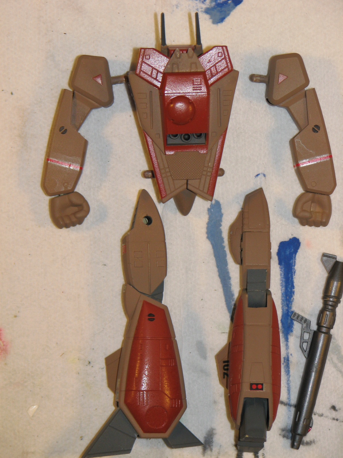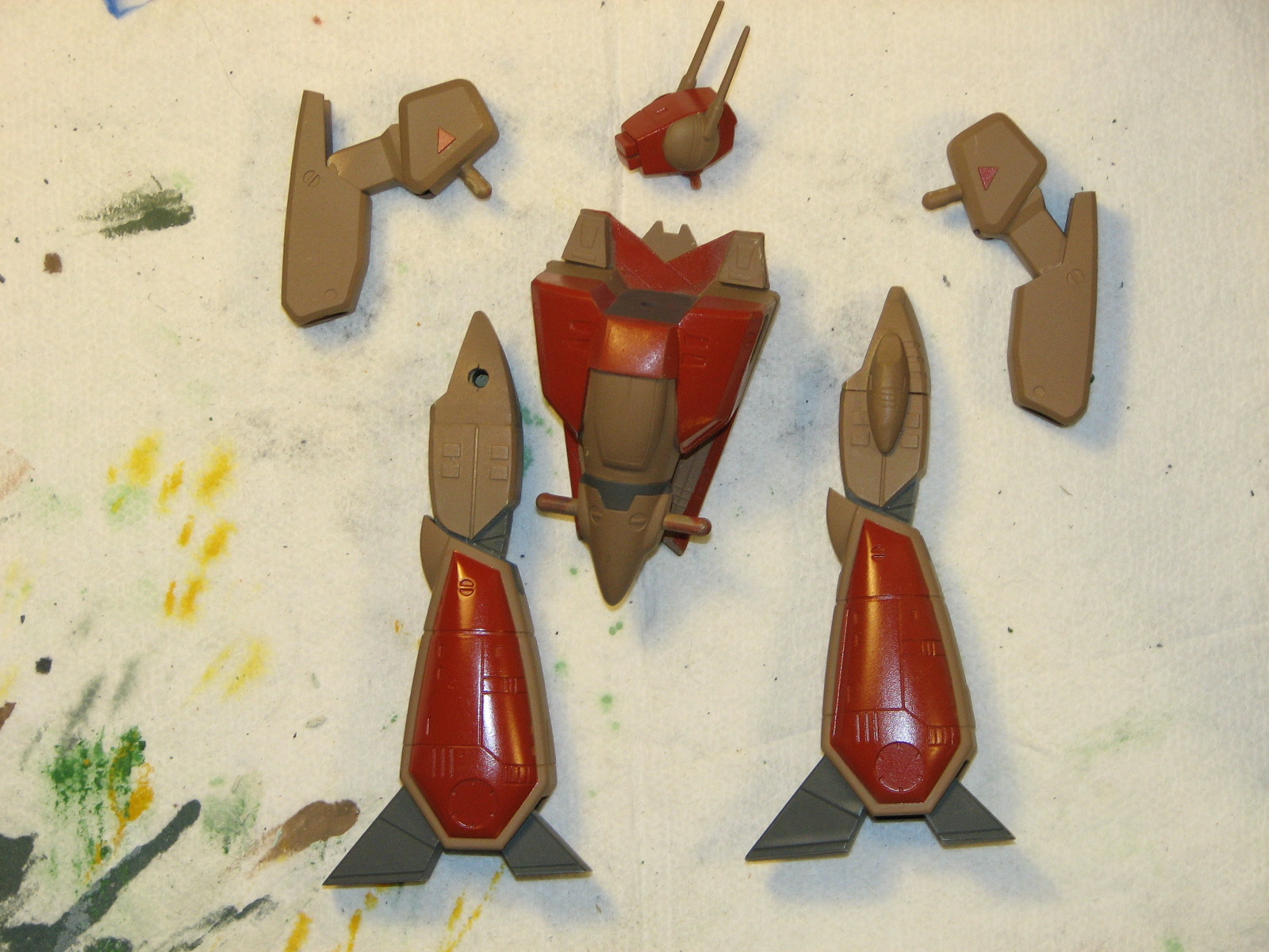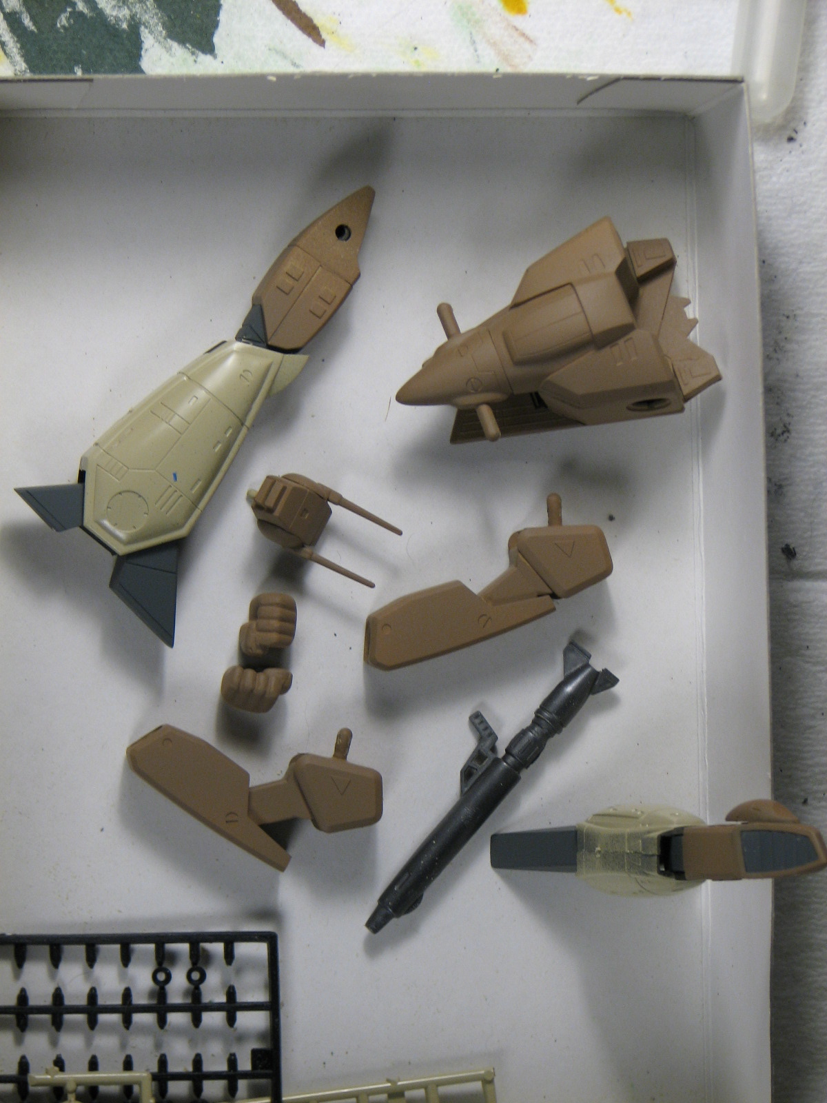 5/26/2010 - I had my VF-1S kit out for some exercise and figured I might as well see where this was. So, after a brief round of some seam touch up and a dab or two of putty I can load up the airbrush and paint some sub-assemblies.