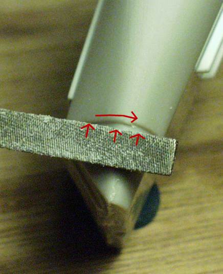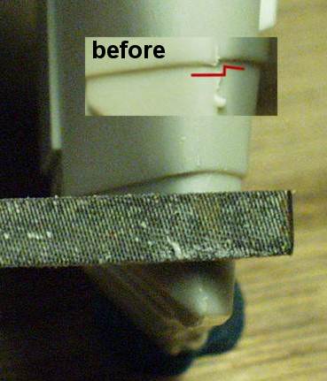 Press the file up against the offset, since that's the plastic you're trying to remove. Don't press the file again the plastic under the large flat side of the file or you'll end up with a flat spot on this curved surface. |