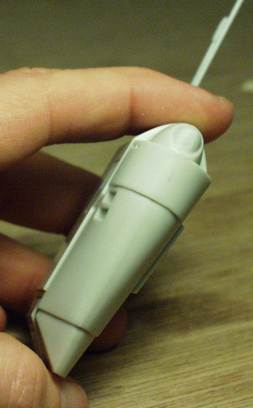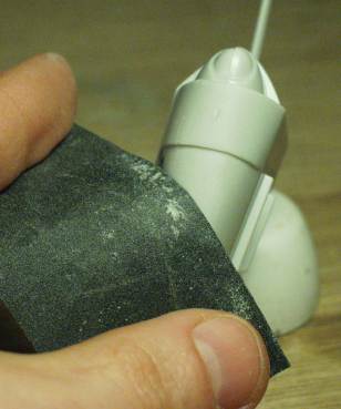 battledroid/STAP kit) only required sanding to finish the seams. In most cases, holding the sandpaper stretched & held by 4 fingers works for sanding curved edges. In the picture, the index & middle finger hold one end of the sandpaper; thumb and ring finger hold the other. Note: this piece was wet-sanded, even though the pictures were taken "dry." |